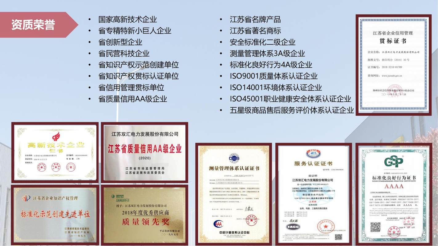 我司以母公司江苏双汇电力发展股份有限公司为核心,下辖扬州市双宝电力设备有限公司、上海润京能源科技有限公司、湖南湖大华龙电气与信息技术有限公司、北京云道智造科技有限公司等多家全资及控股子公司。公司已获得ISO9001质量管理体系、ISO14001环境管理体系、ISO45001职业健康安全管理体系认证,连续多年被评为江苏省重合同守信用企业。