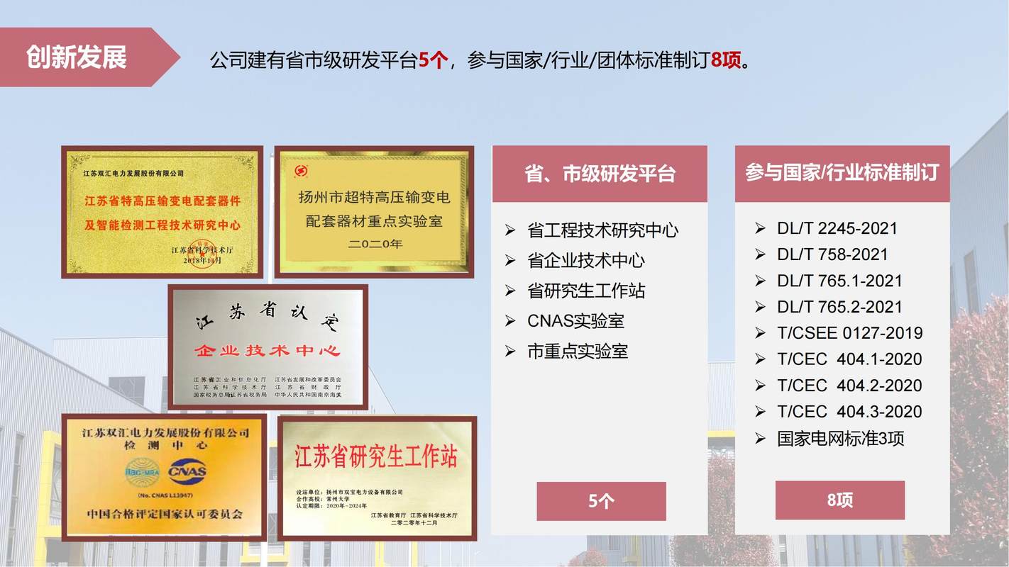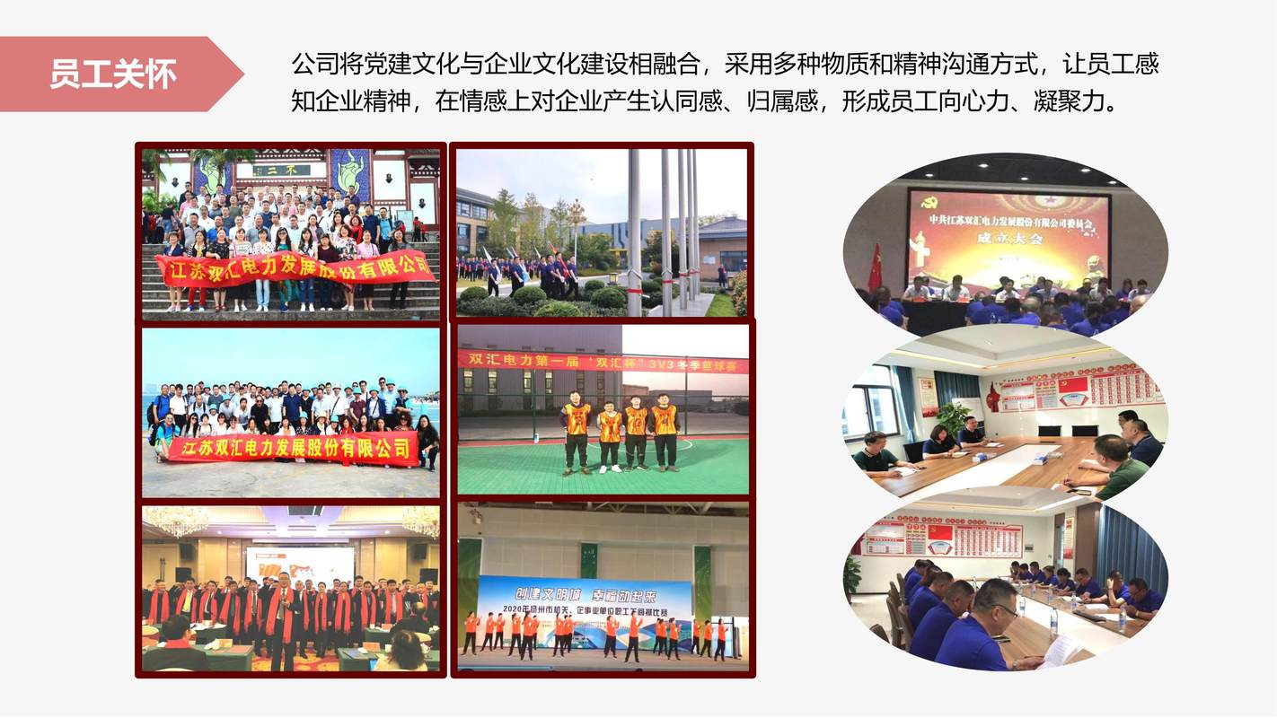 我司始创立于1974年,2008年11月7日正式更名为江苏双汇电力发展股份有限公司,目前公司占地面积13万方,员工700余人。企业人才资源雄厚、生产设备齐全、检测手段先进,拥有众多国内领先的生产与检测设备。