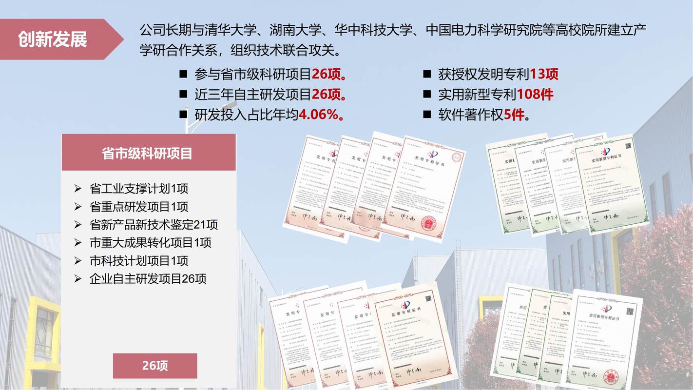 我司始终专注于电力行业的技术创新和深度研发工作,不断攀登行业制高点,积极与国家电网、南方电网、平高集团等大型企业及清华大学、湖南大学、国网电科院等高校院所合作,引进先进技术开发新产品。我司引进日本旁路不停电作业核心技术,自主研发相关产品以及代理各带电作业工器具品牌。截至目前,我司已取得省部级以上科技成果10余项、国家专利、软件产品和计算机软著权证等自主知识产权近百项。