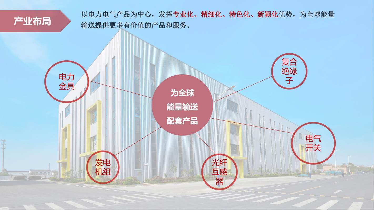 我司研发并生产涵盖各电压等级的电力金具、复合产品、成套电气设备、带电作业工器具等。我司电力金具产品包括直流±1100kV、±800kV、±660kV、±500kV及交流1000 kV 、750 kV、500 kV、330 kV、220 kV等电压等级的悬垂线夹、耐张线夹、连接金具、防护金具、接续金具、拉线金具等。我司复合产品包含高压悬式复合绝缘子、超特高压悬式复合绝缘子、模压复合绝缘子、特高压支柱复合绝缘子等系列产品。我司成套电气设备主要有20kV、10kV系列开关柜、真空断路器、负荷开关;20kV、10kV系列环网柜(箱);交直流系统、无功补偿装置、配变综合检测终端、低压配电产品等高低压电气产品。我司带电作业工器具产品主要包括输配电线路工程压接、切断、冲孔、弯曲施工机具、带电作业施工安全防护、绝缘器具以及专业仪器仪表等。